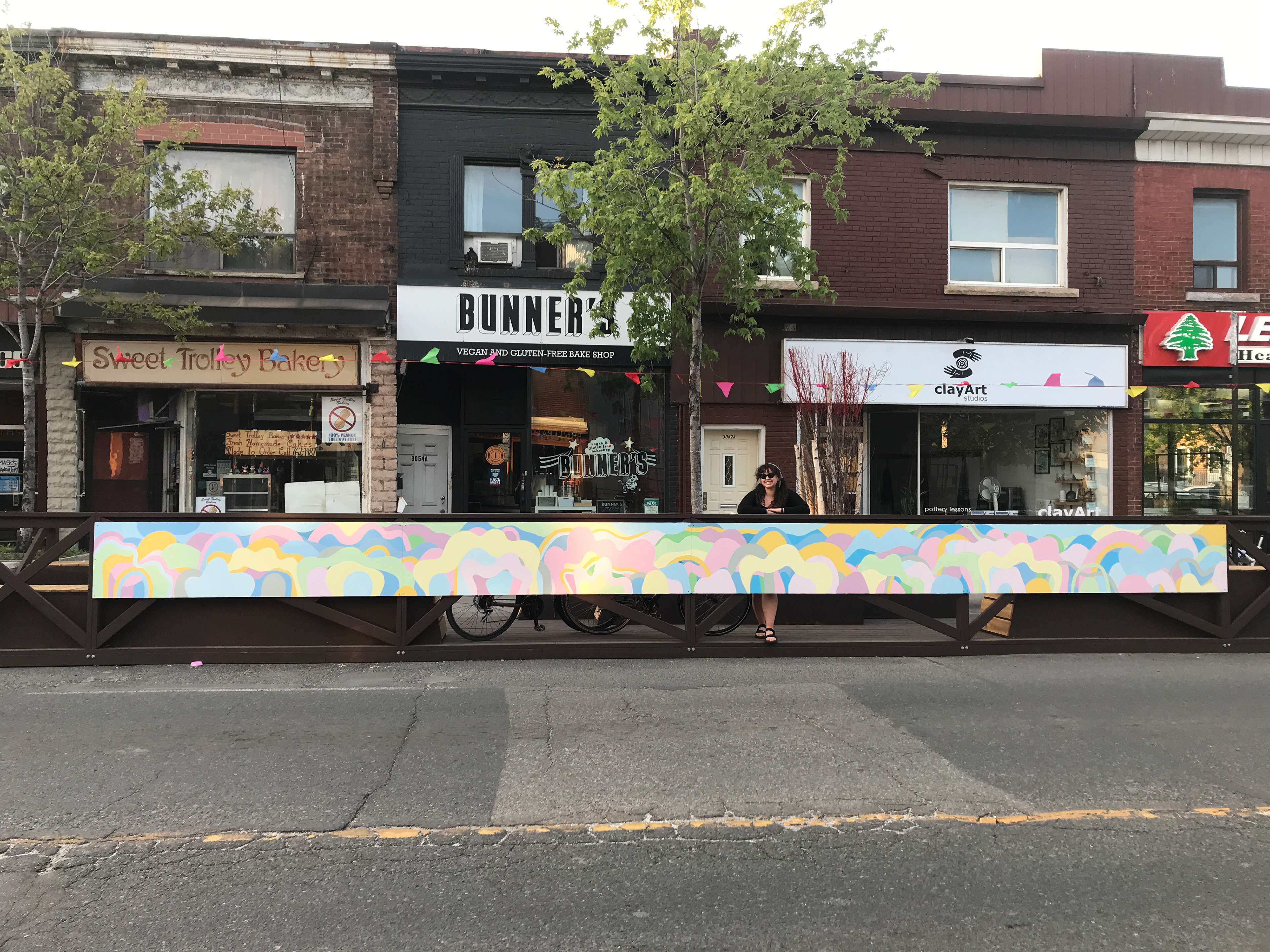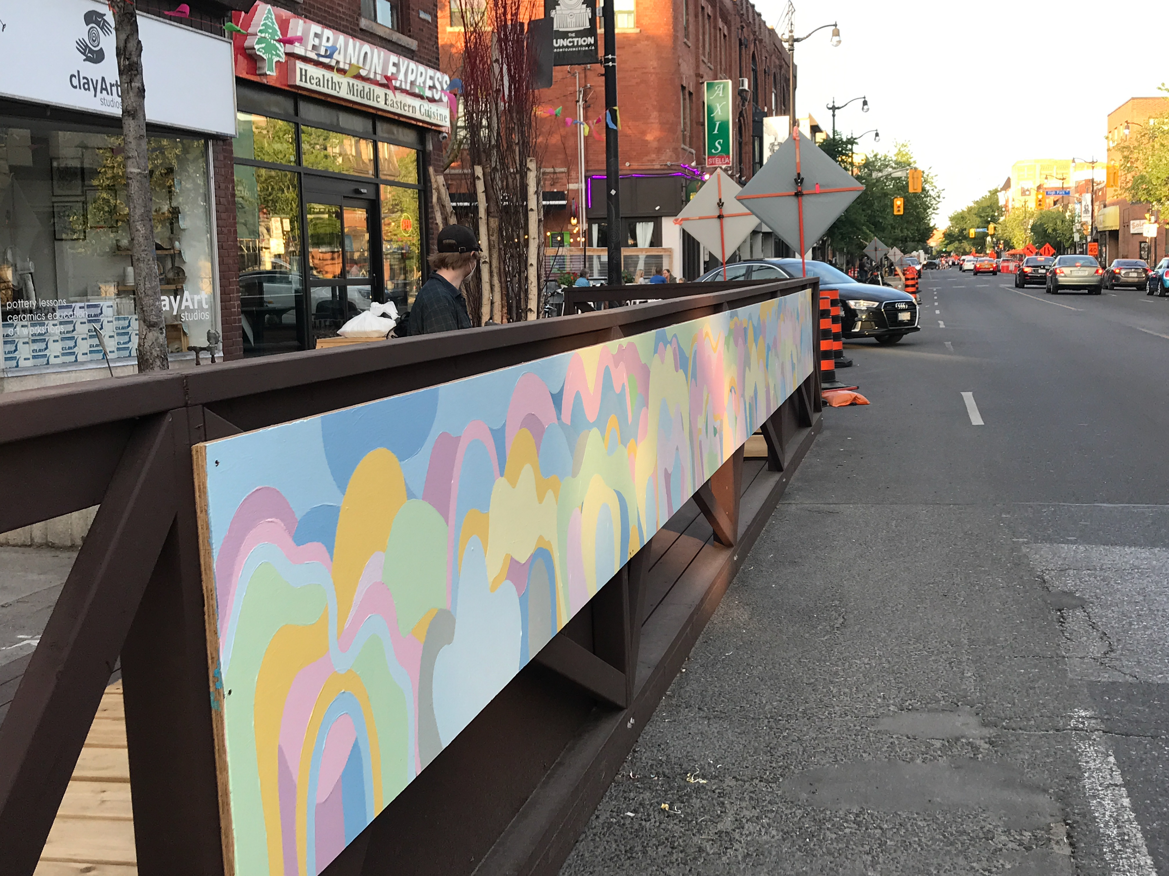 This artwork is comprised of a variety of organic shapes made of acrylic paint, layered on top of one another, on plywood. My artwork explores not only composition and colour relationships, but also themes of nature and the landscape informed by my experiences growing up in rural areas, and now living in the very urban landscape of Toronto. The goal of this piece is to create a landscape that the viewer can exist in and explore, as well as evoke feelings of summertime and the joy that I experience while being in nature during the summertime. While creating this piece, I worked in a similar fashion to the way I work on any of my paintings, in which I allow the painting to inform it’s own composition throughout the process. My paintings morph throughout the creation process, and this one did as well. As I create, I listen to what the painting wants to be, and make it happen. This is how the colour palette for this work was created. I began with a variety of colours, and as I worked I narrowed down which colours felt that they belonged with the painting, and painted over any that I felt were not integral to the composition. In its completed form, it is made of pastel and light colours, with more saturated colours sprinkled throughout, using colours that I associate with summertime. I also considered the environment that this painting would exist in, and as it will be street-facing I aimed to create a composition that would flow with the things that exist in that environment such as passing cars or cyclists. The composition has a sense of movement as the hills bob up and down, and wiggle from side to side, mimicking the bustling movement of the street it will be situated on. I considered the variations in speed of viewer, and created a work that I intend to be visually interesting and full of life while viewing from a stand-still, or a fast moving vehicle.